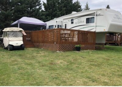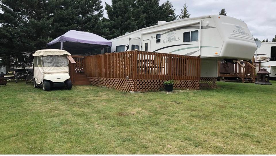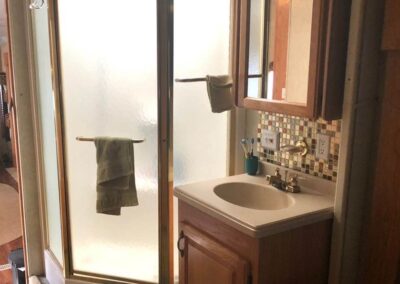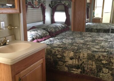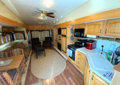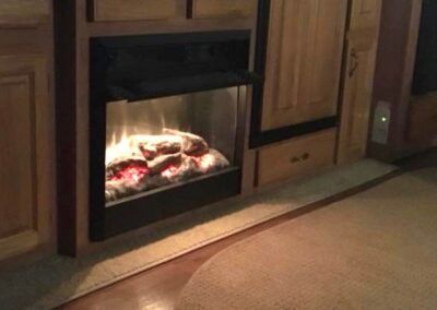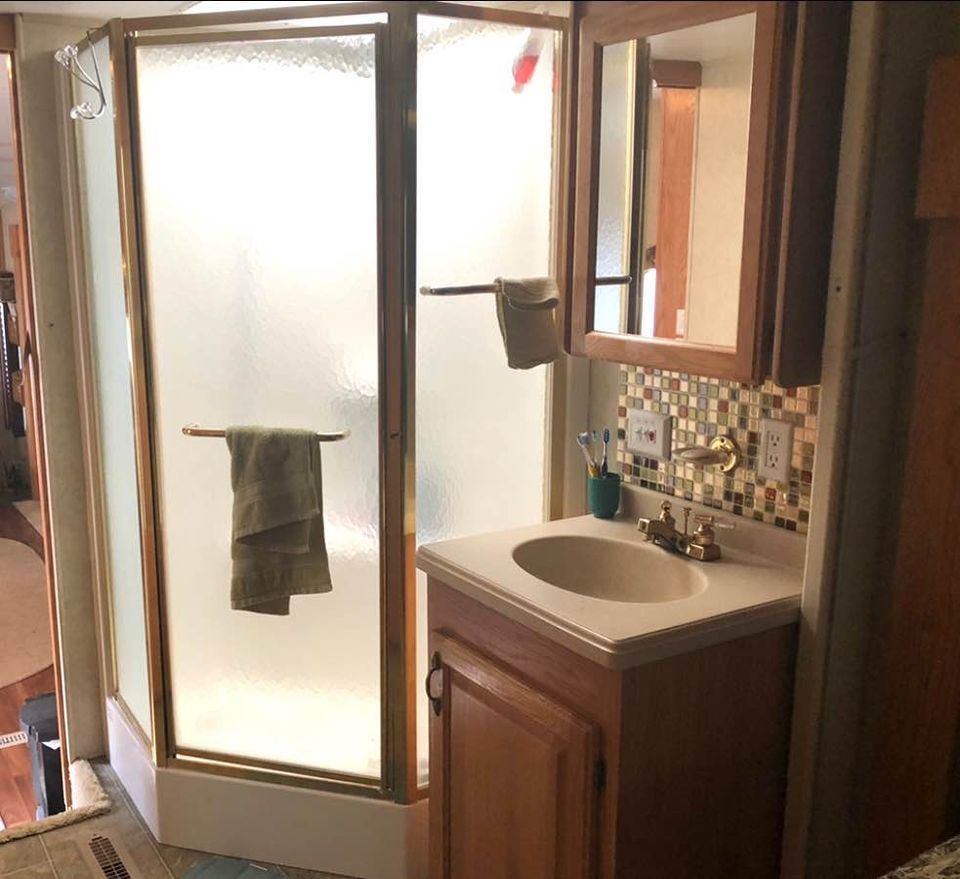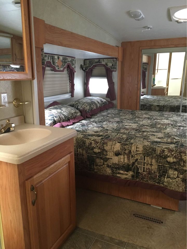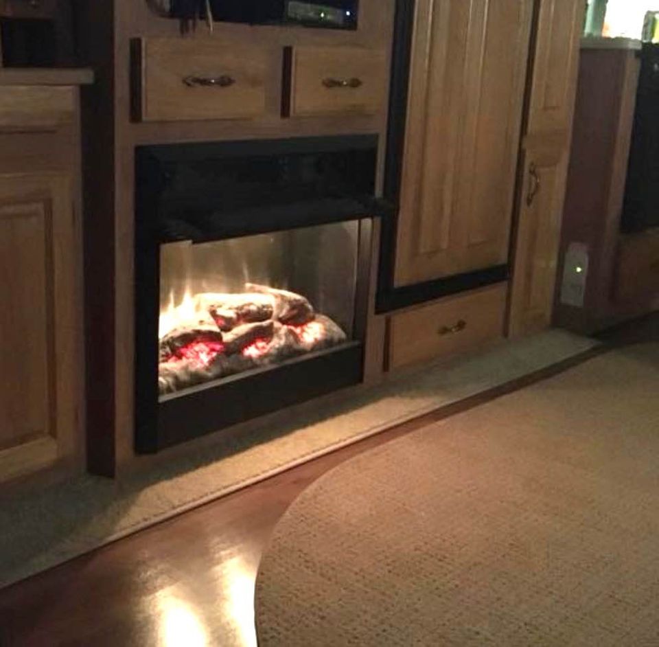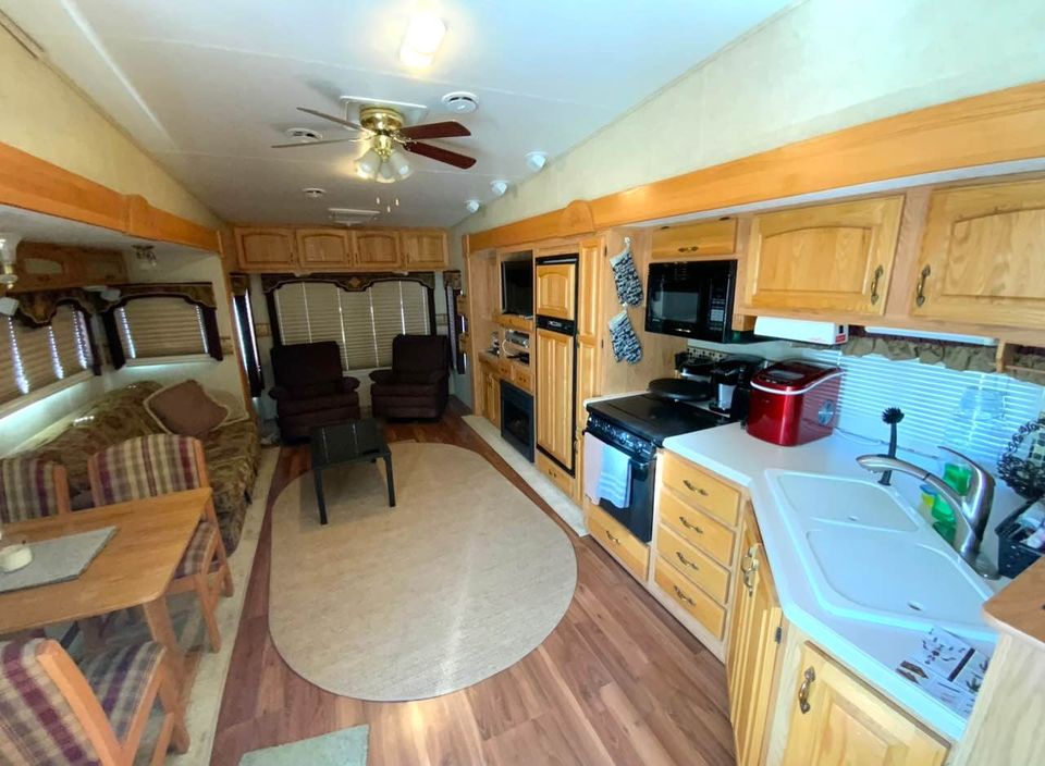 King size bed, sleeper sofa, 2 recliner chairs, Fireplace, dinette set, Tv, DVD player, Full-size corner shower, Fridge, Stove, Microwave, Laundry hookups, Air conditioning